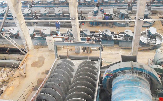 三、研磨后的物料給至螺旋分級機,螺旋分級機借助固體顆粒的比重、粒度不同、而在液體中沉淀的速度不同的原理,對礦石混合物進行洗凈和分級。